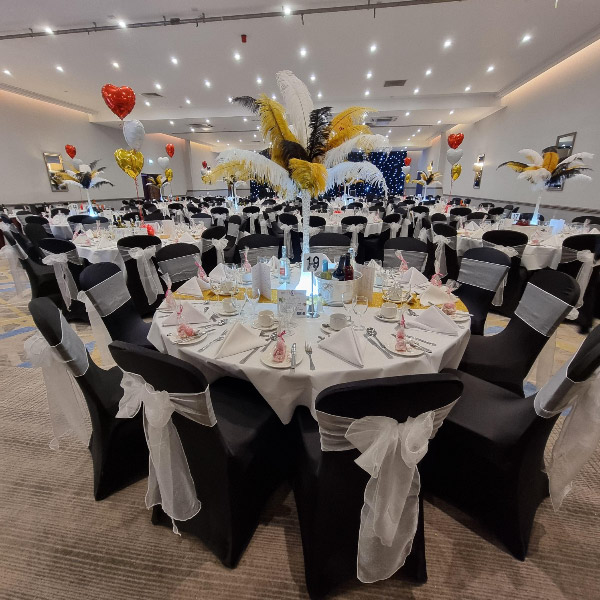We deliver locally to Warwickshire, Leicestershire, Northamptonshire and Bedfordshire as well as nationally for larger events. Our most recent event was for black chair covers with white organza sashes set up at Hinckley Island for the Coventry & District Funeral Directors Guild where we also supplied balloons and ostrich feather centrepieces. Please contact us for a quote including delivery costs.