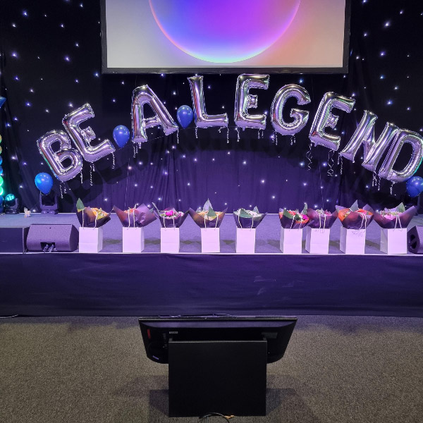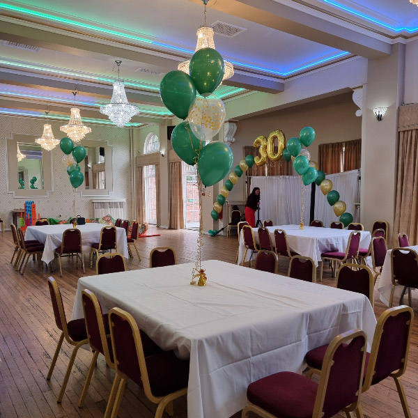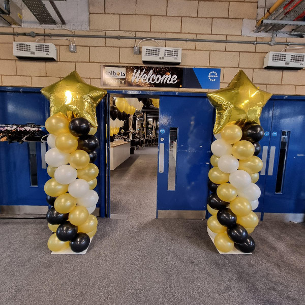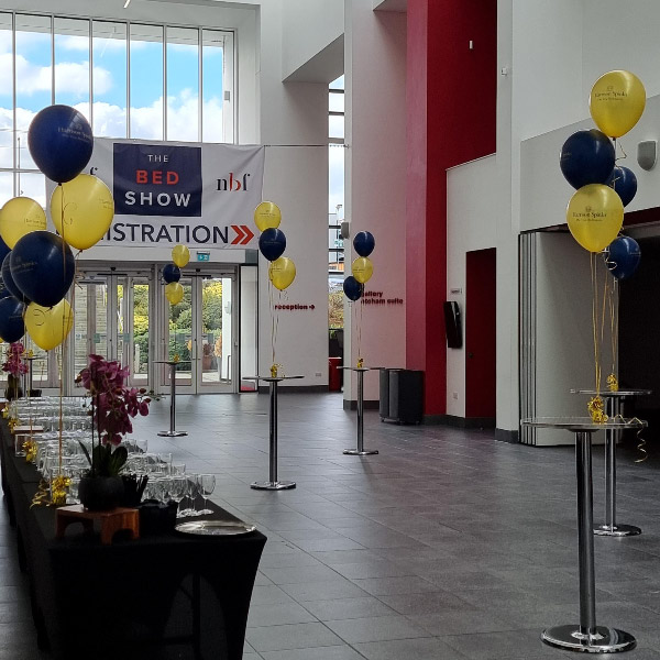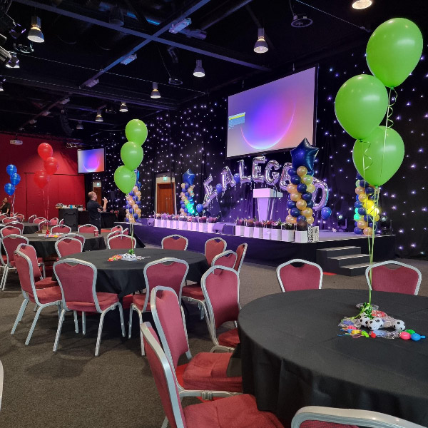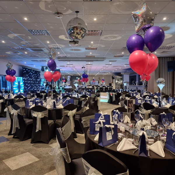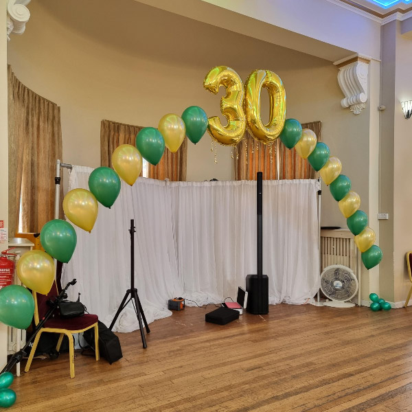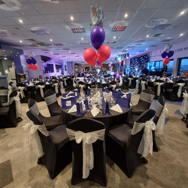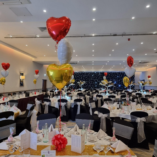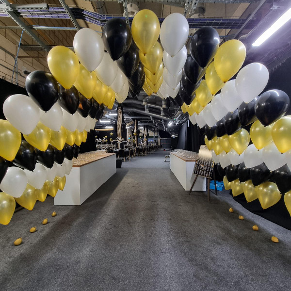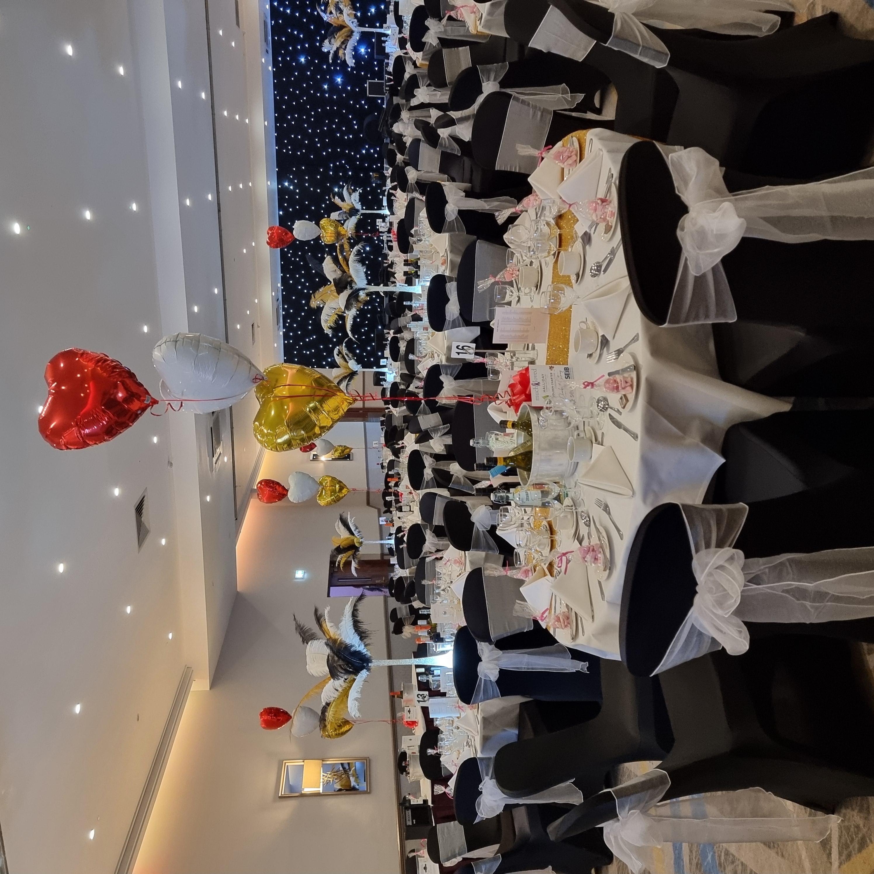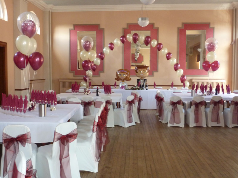We can also prepare balloon arches, columns and floor standing balloons to add the finishing touch to your event. We also fit chair covers and can supply black table cloths as well as table centrepieces and entrance displays.