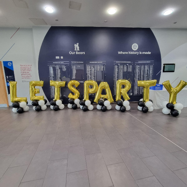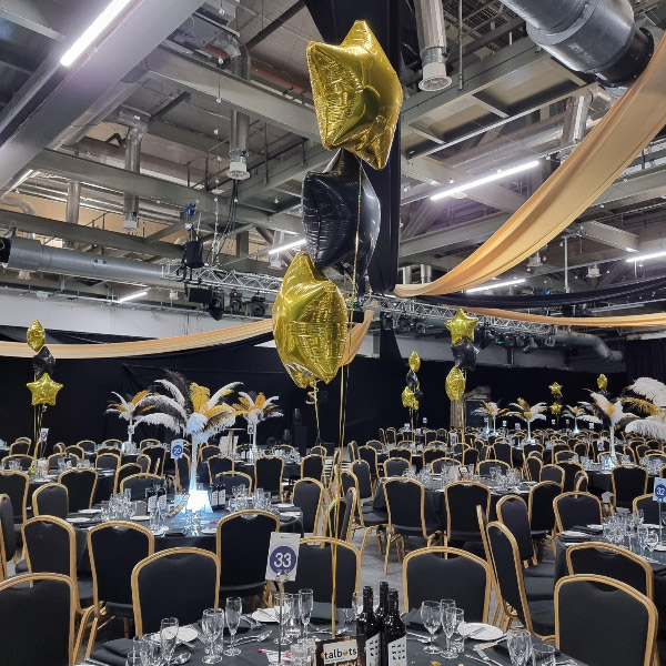 We specialise in corporate events but can also supply for parties, proms and occasionally weddings. Our latest work included black and gold star balloon bouquets, columns and a tunnel arch with a LETS PARTY balloon display and ostrich feather centrepieces at Edgbaston County Cricket Club for Talbots Solicitors annual event.