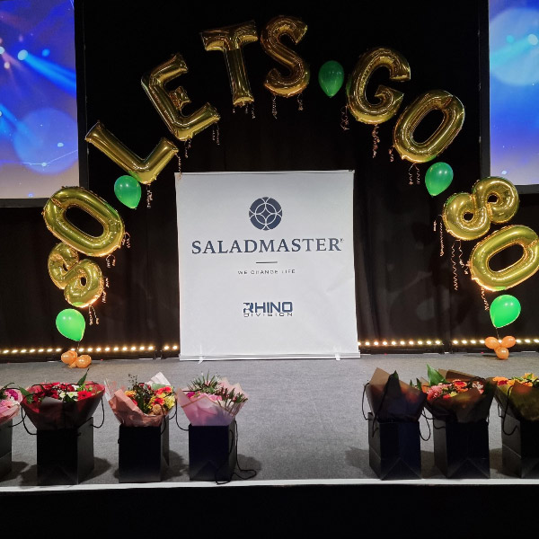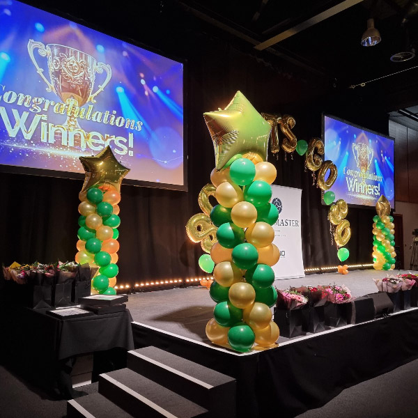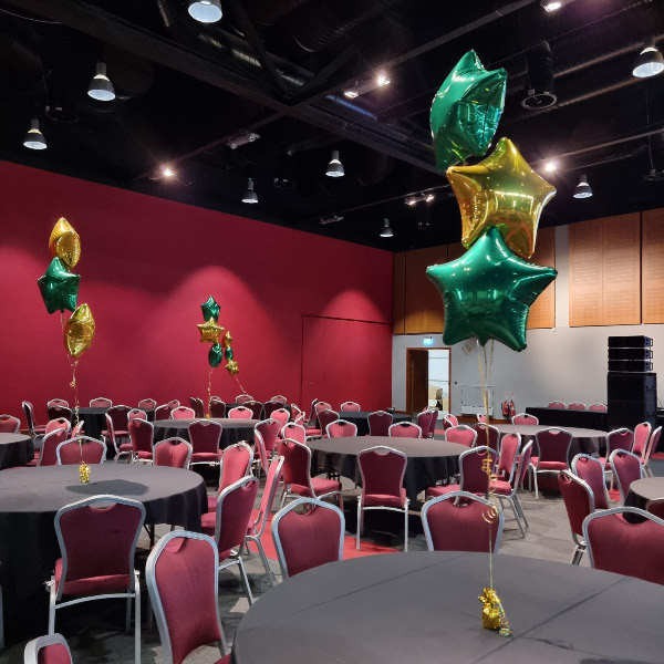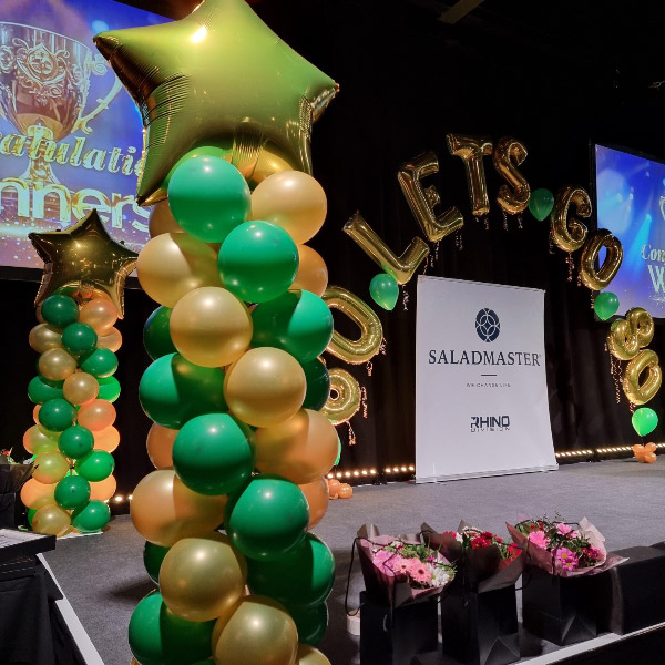 We specialise in corporate events but can also supply for parties, proms and occasionally weddings. Our latest event was for one of our regular clients, Saladmaster at Telford International Centre, where we set up foil star shaped balloons, four balloon columns and a name arch.