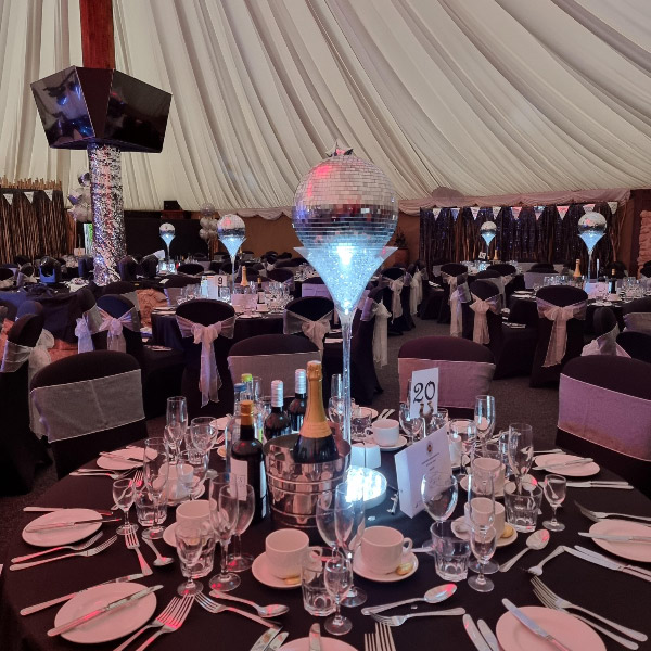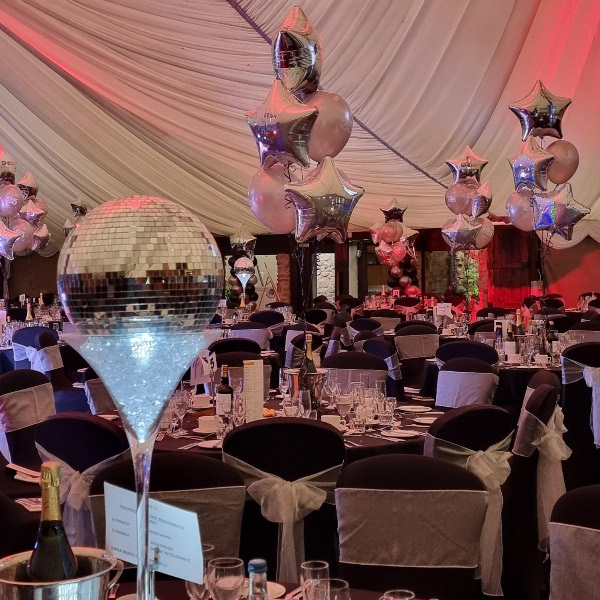 Our popular Mirror Balls centrepieces are ideal for corporate and themed events as well as awards ceremonies. We stand each Mirror Ball on top of a large 60cm martini glass vase which is filled with beautiful acrylic crystals to reflect the light. Each Mirror Ball centrepiece then stands on an 8-inch light base with either white or coloured LED lighting.