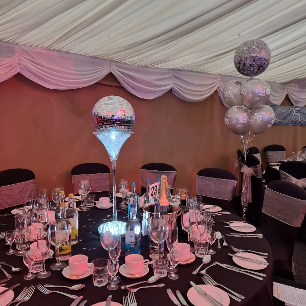 Cost = £45 per Mirror Balls centrepiece including LED lighting. Table mirrors and table crystals are optional extras.