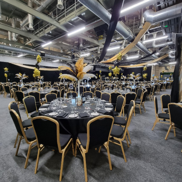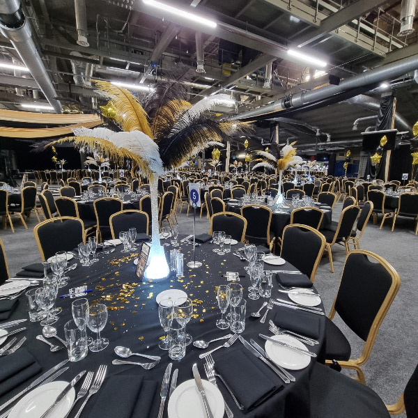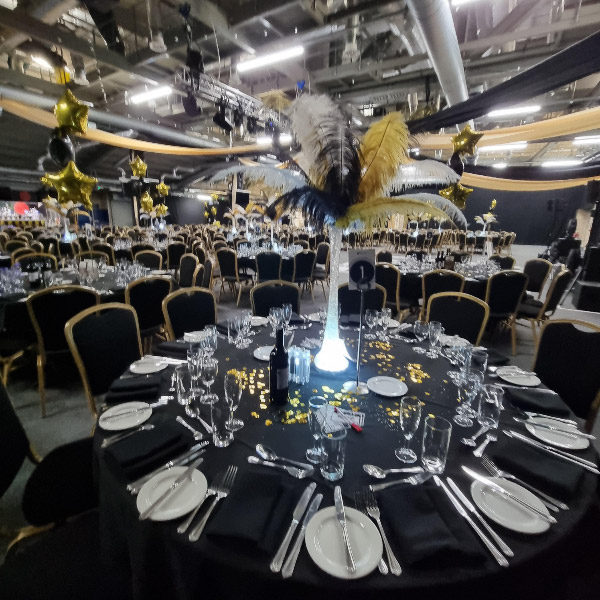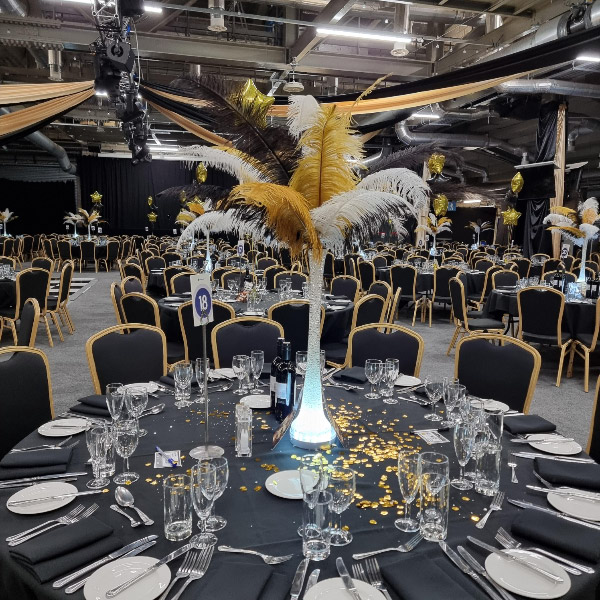 Nationwide delivery available on larger orders. Local delivery areas include Rugby, Coventry and Warwickshire, Leicestershire, Northamptonshire and the West Midlands. We have delivered our ostrich feathers to Manchester, London, Leeds, Hull and many other cities so please ask for a quote. Our most recent event was for Talbots Solicitors for their event at Edgbaston County Cricket Club using our illuminated gold, black and white ostrich feather centrepieces along with sets of balloons and other decor.