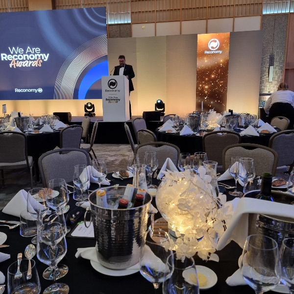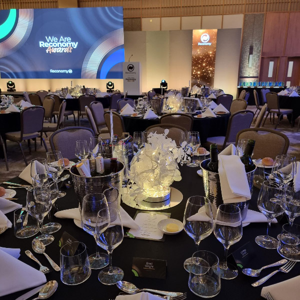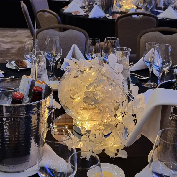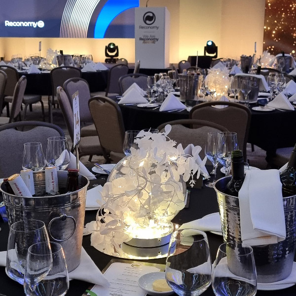 These table centrepieces are ideal as a low table centrepiece where it is important that no view is blocked but can also be mixed with our tall white leaf tree centrepieces. Our latest event was for Reconomy at the Belfry.