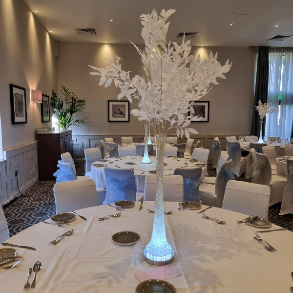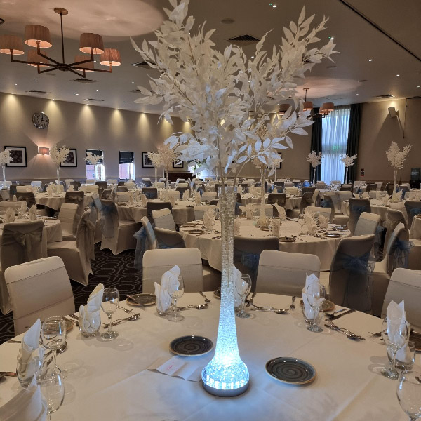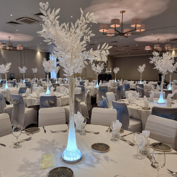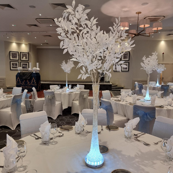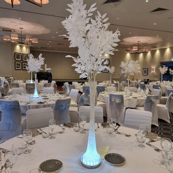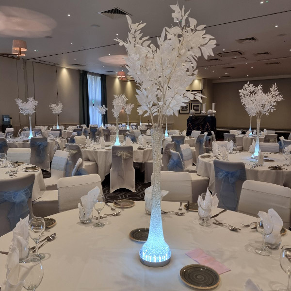 Our beautiful white leaf tree centrepieces stand 1.2 metres tall and are illuminated with LED white or coloured lights. Lighting illuminates the vase and is also reflected onto the white leaves. It is therefore ideal for a white-themed event or is suitable for a colour-themed event. As the leaves are white they will also pick up from any overhead venue lighting.
