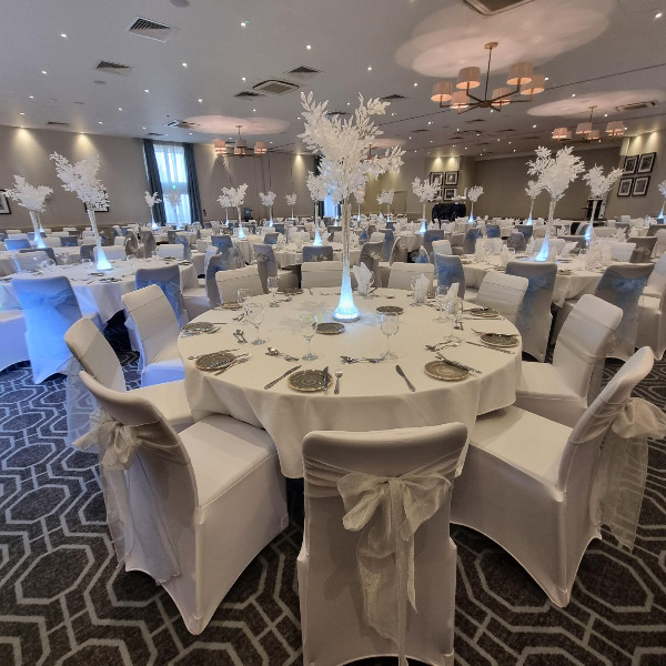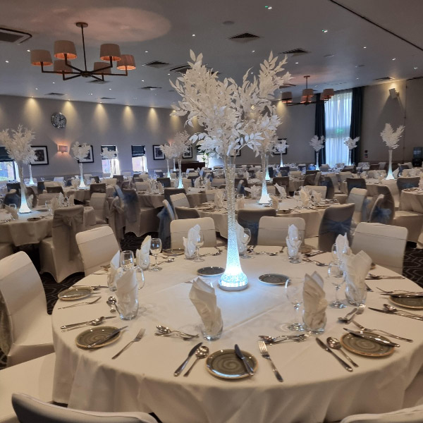 Suitable for parties and corporate events. Ideal for themed events such as Winter Wonderland, fire and ice and Christmas party events, charity and awards events and gala dinners. Our latest setup was for the Staverton Park Christmas parties who had white leaf trees and chair covers fitted for all of their Christmas events.